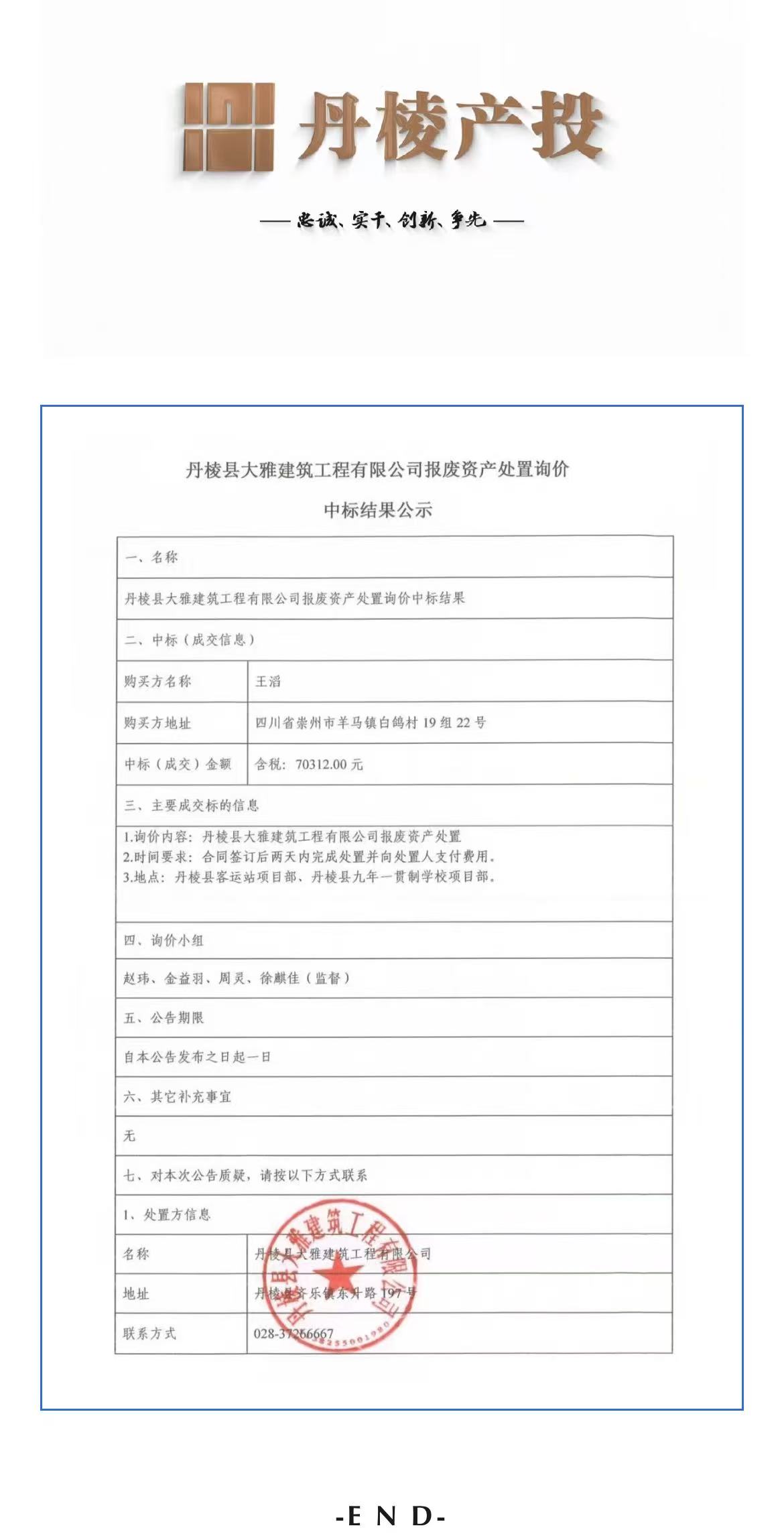丹棱縣大雅建筑工程有限公司報(bào)廢資產(chǎn)處置詢(xún)價(jià)中標(biāo)結(jié)果公示